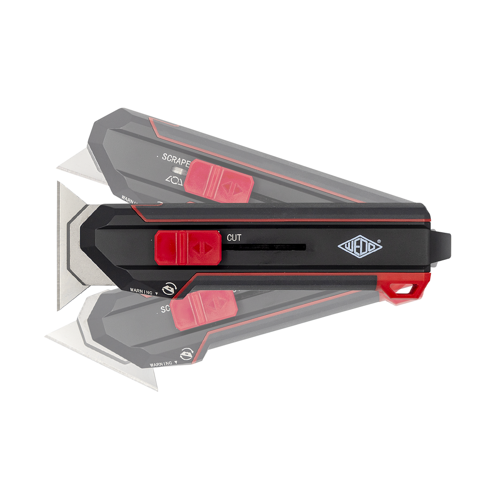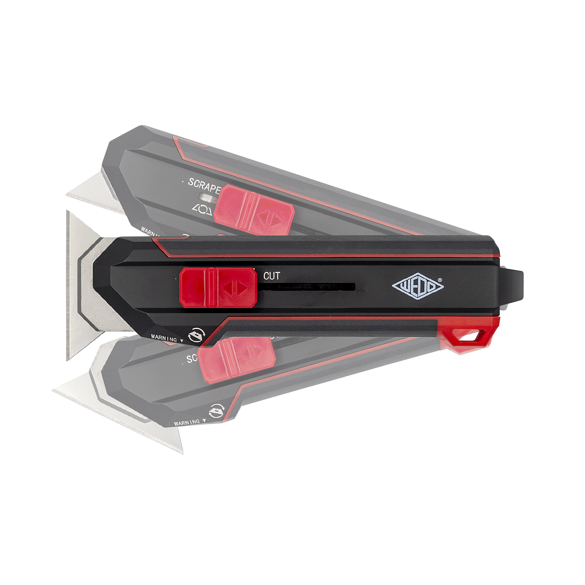 Mit drehbarer Klinge - Schneiden, Folien auftrennen und Reste abschaben gelingt mit diesem Cutter in einem Werkzeug. Mit dem Schieber wählen Sie die jeweilige Funktion und werden im Arbeitsprozess nicht durch das Wechseln zu einem anderen Spezialwerkzeug unterbrochen. Mit dem stabilen Haken am Ende des Cutters lassen sich übrigens Blechdosen ganz einfach öffnen.