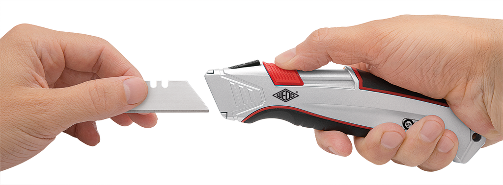 WEDO® Safety-Cutter ALU im leichten Aluminium-Gehäuse mit automatischem Klingenrückzug. Die federbelastete Trapezklinge zieht sich nach dem Schnitt automatisch zurück (Schieber während des Schneidens nicht festhalten). Das robuste Aluminiumgehäuse mit gummierter Griffzone liegt leicht und sicher in der Hand.