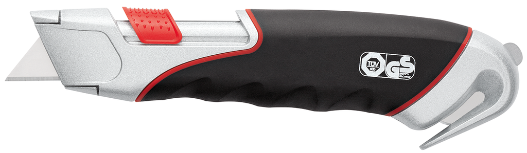 Sicherheitscutter mit vollautomatischem Klingenrückzug, ergonomischem Metallgriff und integriertem Folienschneider – mit verdecktem Rundmesser für Folien, Bänder und Umreifungen.