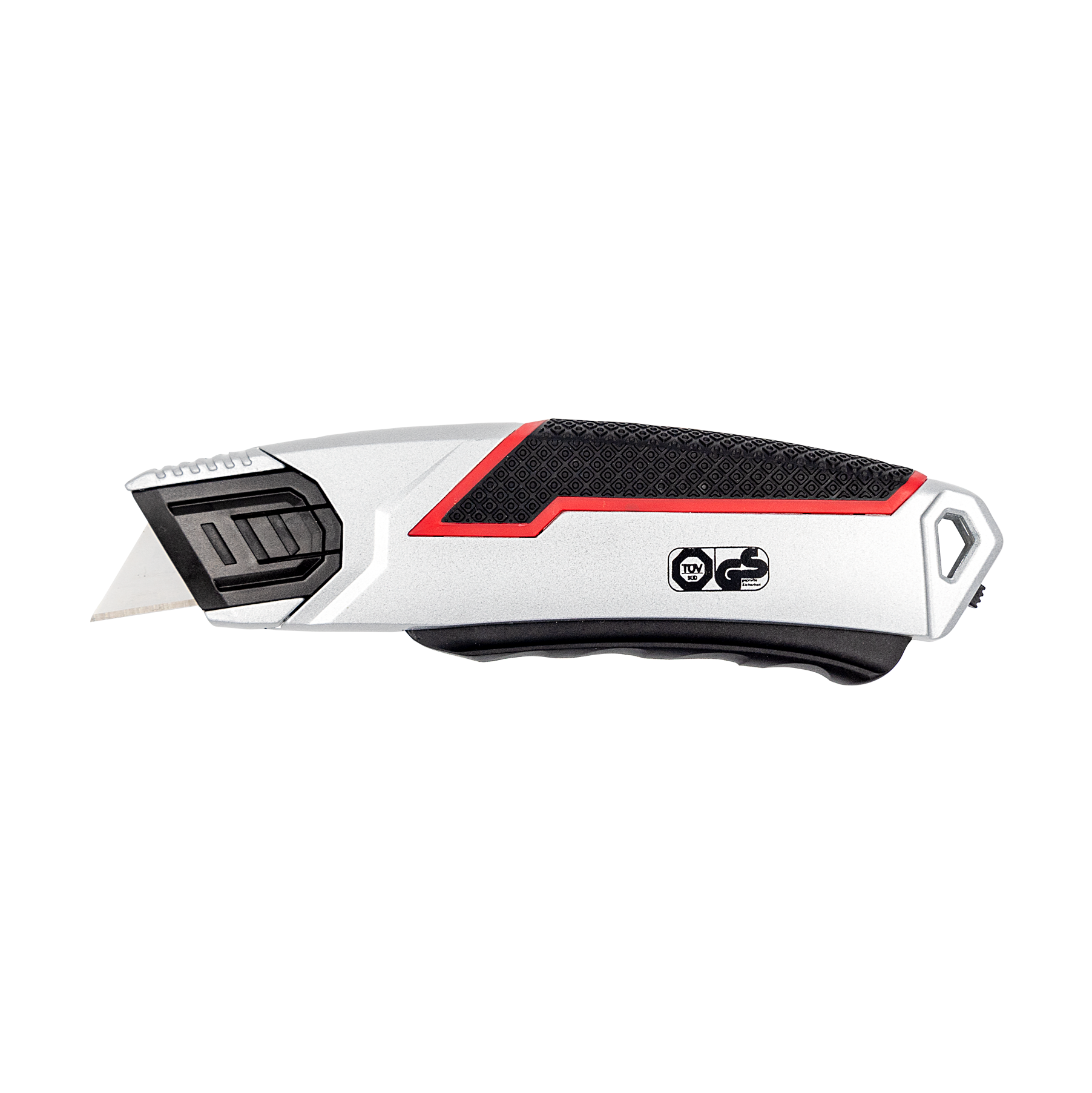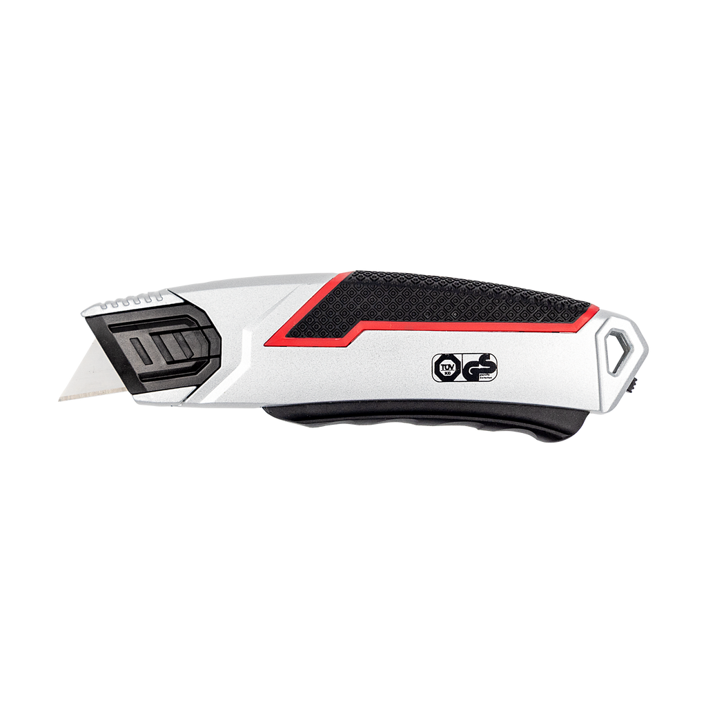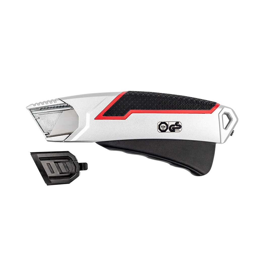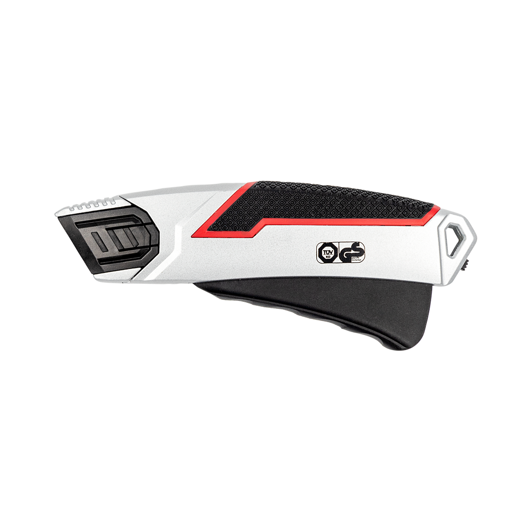 Stabiler Sicherheitscutter aus Zinklegierung mit gummierter Griffzone, automatischem Klingenrückzug und arretierbarem Hebel – TÜV/GS geprüft für sicheres und komfortables Schneiden.