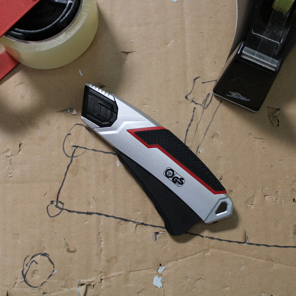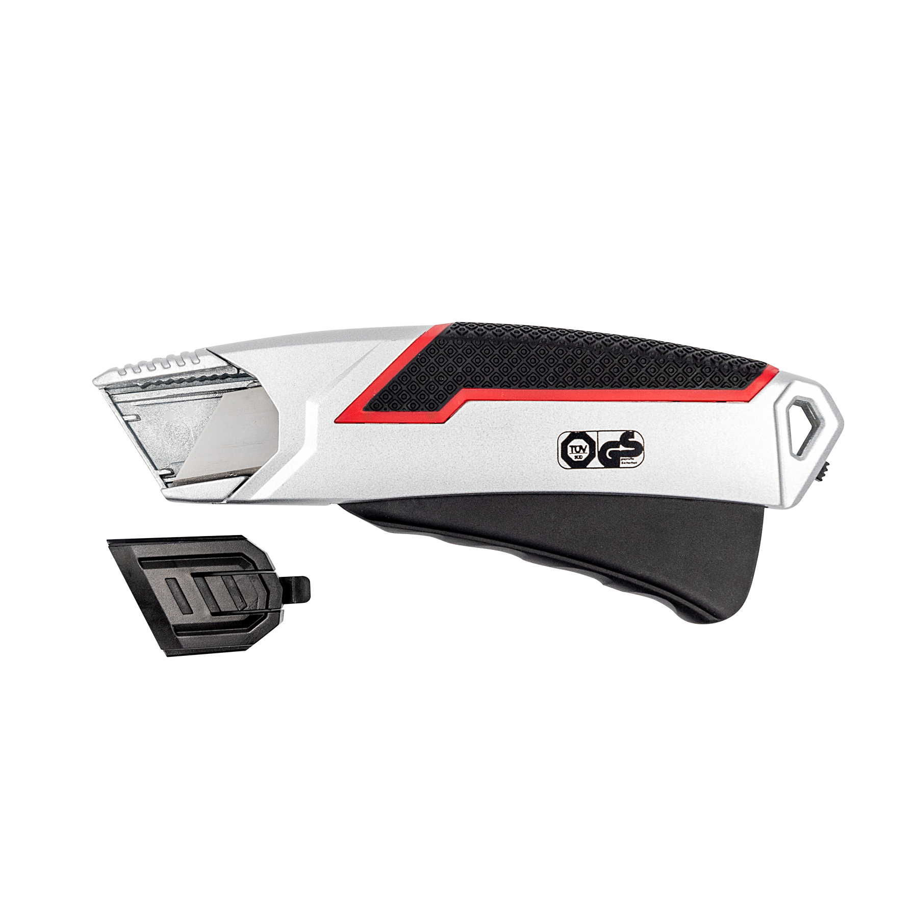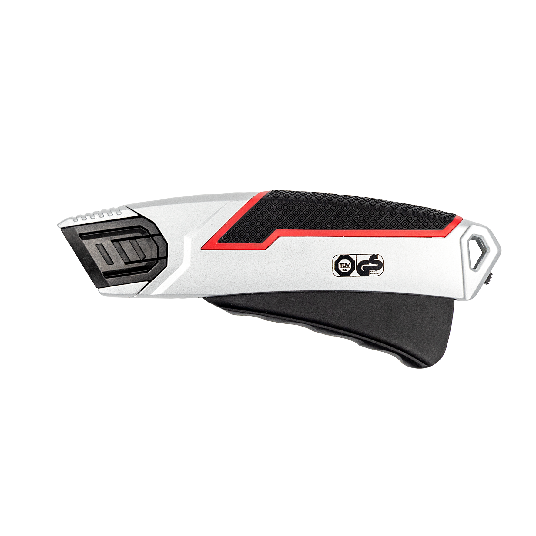 Stabiler Sicherheitscutter aus Zinklegierung mit gummierter Griffzone, automatischem Klingenrückzug und arretierbarem Hebel – TÜV/GS geprüft für sicheres und komfortables Schneiden.